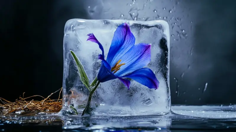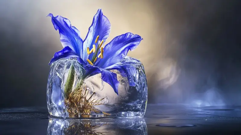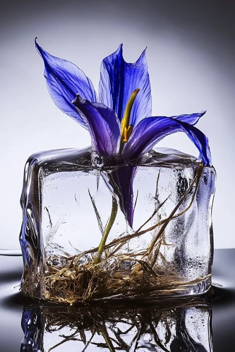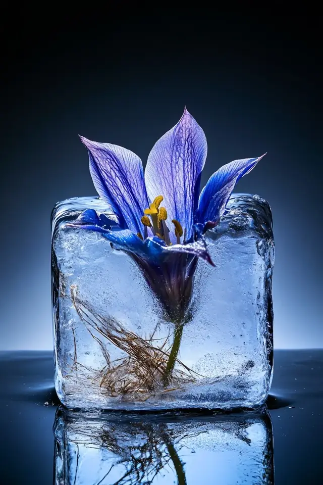 studio photography of 1 vibrant blue trumpet-shaped Alpine Gentian blossom, standing tall in side view, front angle camera shot, medium close-up, with five pointed petals forming a trumpet shape and small yellow stamens visible inside, totally encased in a spherical square block of ice with transparent water droplets and dried straw-colored vegetation, dramatic lighting from below creating a high-contrast scene against a dreamlike ethereal bokeh background , backlighting creates a luminous effect that makes the ice appear to glow against the dark backlit fog, on reflective surface with liquid surface, striking deep blue to purple colors, Canon 50mm f/1.8 lens, intricate details, hyperrealistic, 8K --ar 9:16 --quality 2 --style raw --profile n4rt75m --stylize 0