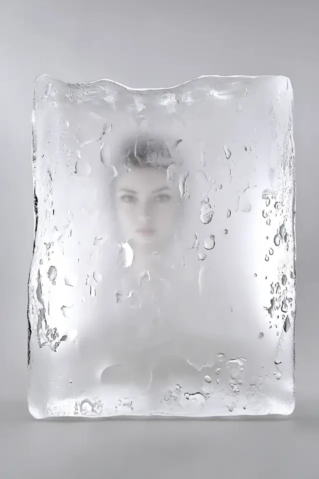 portrait photography of an elegant lady, shining through a thick layer of frosted ice texture, totally encased in translucent ice block with water droplets, on a white background, detailed, photographic, photorealistic, hyperrealistic --ar 2:3 --style raw --profile n4rt75m pmpsvxw --sw 700 --stylize 0