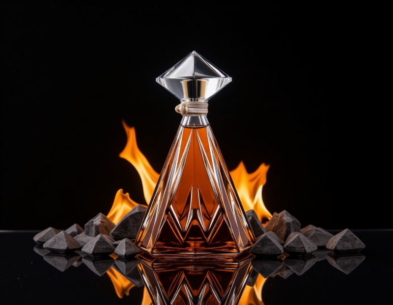 a professional product shot of a stunnnig crystal glass cognac bottle, distinctive pear-shaped form, 45 degree downward angle, 3/4 view angle, warm amber brown cognac liquid, with intricate diamond glass patterns, classic and luxurious feel, surrounded by hot glowing charcoal embers with sparks, simple black backdrop, Canon RF50mm f1.8 prime lens, --ar 3:2 --style raw, high resolution, high detail, high quality --ar 3:2 --style raw --profile rpv3m9v --stylize 0 --v 6.1
