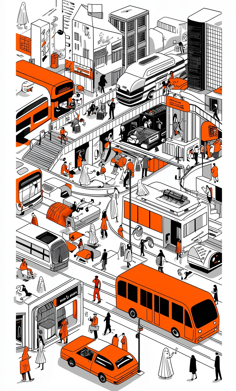 highly detailed and busy Wimmelbild illustration, overhead bird's eye view, containing numerous small scenes of means of public transportation in a modern city, subway platforms, tram stations, bus hubs, taxi cabs, where little silvery-white ghosts interact with humans, revealing intricate layers of human and spectral activities, packed with intricate details, inviting to explore and discover multiple stories, blending everyday routine with supernatural whimsy, creating a sense of hidden wonder withing urban infrastructure --ar 9:16 --quality 2 --style raw --sref 955852072 --profile n4rt75m --stylize 150
