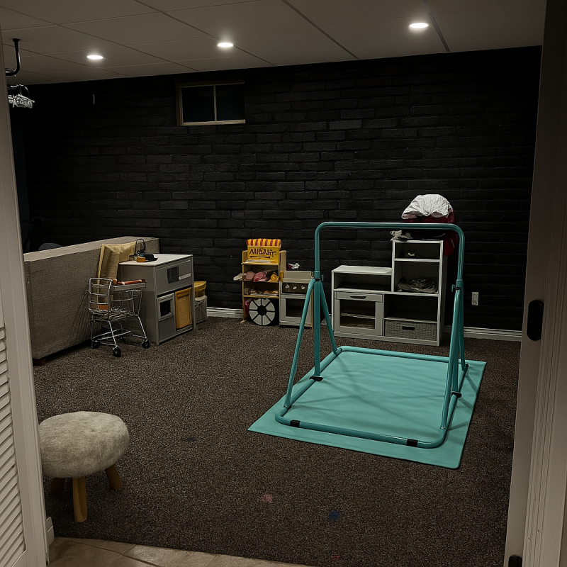 Make an image where the wall in the first photo is like the wall in the second photo. Keepp the layout and composition of the first photo as accurate as possible, only replacing the gray wall with the black wall.