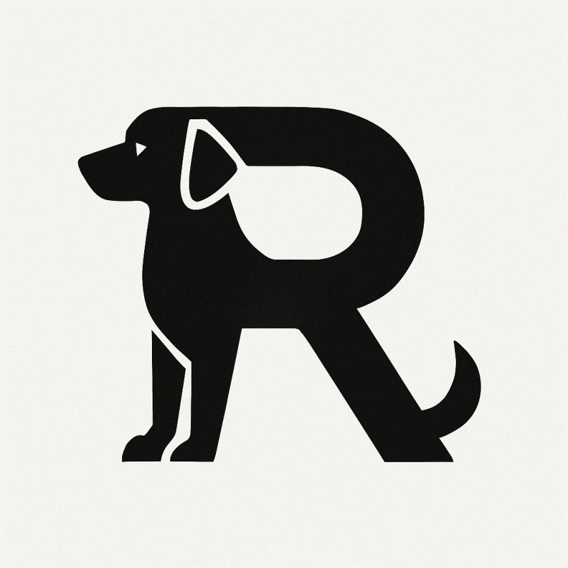 Create a modern, geometric black-and-white logo that combines the uppercase letter 'R' with a stylized silhouette of a dog. The design should integrate the dog into the shape of the letter in a clever, minimalist way, suitable for branding a contemporary pet-related business or tech company.