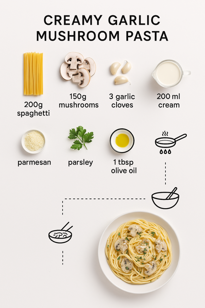 Create step-by-step recipe infographic for creamy garlic mushroom pasta, top-down view, minimal style on white background, ingredient photos labeled: "200g spaghetti", "150g mushrooms", "3 garlic cloves", "200ml cream", "1 tbsp olive oil", "parmesan", "parsley", dotted lines showing process steps with icons (boiling pot, sauté pan, mixing), final plated pasta shot at the bottom