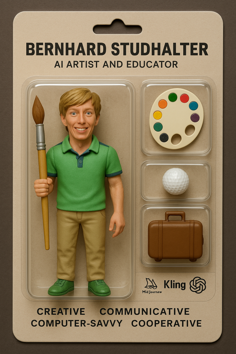 Turn the person in this photo into a realistic action figure inside plastic packaging like a collector’s toy. The figure should be smiling and posed in an upright position. Add a nameplate at the top and include accessories on one side, like a camera, phone, laptop, and sneakers. Use a black background to highlight the figure, and make sure it looks just like me.