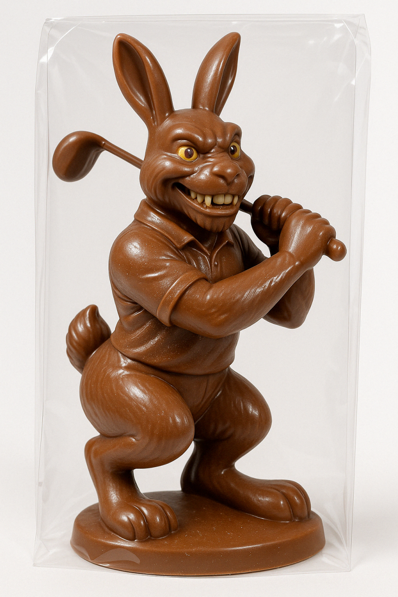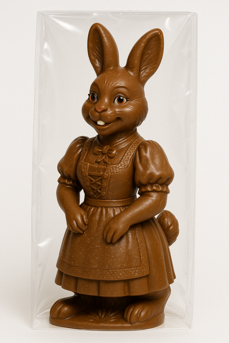 A hyper-detailed, realistic full-body fusion of a female Swiss traditional costume with an easter bunny. The female poses in a traditional Swiss costume with intricate details. The chocolate sculpture is a hybrid character with the upper body of a a woman and the head, ears, forelegs, hind legs, and tail of a bunny in three quarter view. Its eyes and teeth are colored. The sculpture is made from glossy milk chocolate with fine sparkly sugar or edible glitter sprinkled across the surface, particularly concentrated on the arms and shirt. The entire sculpture is encased in clear plastic packaging, standing upright with soft reflections on the plastic. The background is minimal and pure white, studio-lit to emphasize the shape, shine, and texture of the chocolate.
