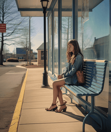 A beautiful party girl waits at the bus stop all alone on an empty street in suburban America, mid-day –ar 2:3 –v 5.2
